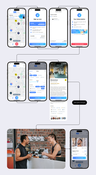We designed a simple and convenient flow for selecting and finding gym partners using a wide range of filters. Initially, we planned to allow access to gyms via QR code scanning. However, during implementation and testing, we encountered physical limitations. We developed several alternatives and ultimately our client chose to generate a pass card within the app, which users present at the gym entrance.