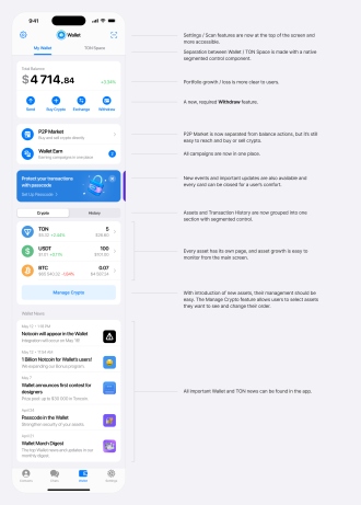 There were a lot of requirements, such as consistency with the existing Telegram UI, simplified navigation, reconsidered separation between Wallet / TON Space, and incorporated space for new assets, features, and promo campaigns.